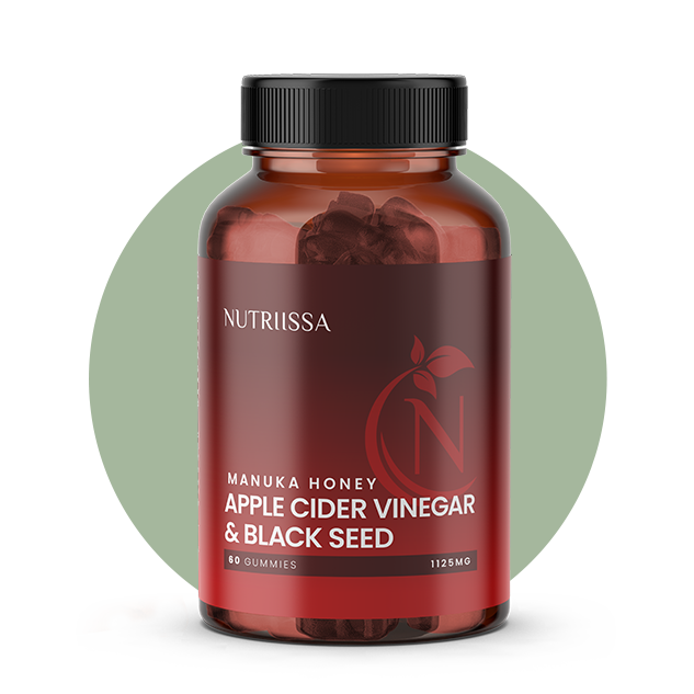 Nutriissa's ACV, BSO, and Honey Gummies contain apple cider vinegar (500mg), black cumin seed oil (100mg), Manuka honey (100mg), pomegranate powder (60mcg), beet root extract (60mcg), and turmeric (25mg) per serving.