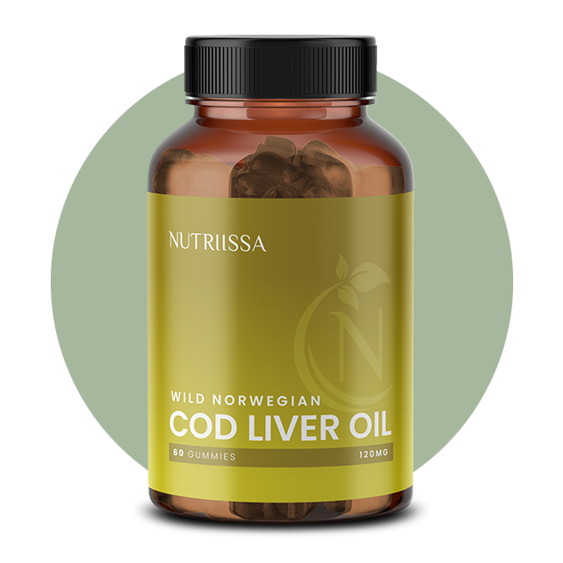Nutriissa's Cod Liver Oil Gummies offer essential Omega-3 fatty acids, DHA, EPA, and vitamins A, D, and E from cod liver oil. Each serving (2 gummies) contains 160 mg of cod liver oil, providing a convenient and tasty way to support overall health and development, especially in children.