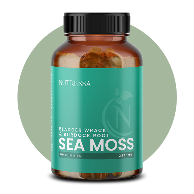 Nutriissa's Sea Moss Gummies contain Irish sea moss (80mg), bladder wrack (50mg), and burdock root (12mg) per serving.